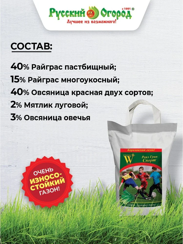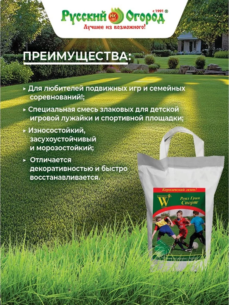 Предназначен для создания спортивных и игровых лужаек. Отличается устойчивостью к большим нагрузкам и способностью быстро восстанавливаться, благодаря специально подобранному составу семян элитных сортов. Также обладает высокой устойчивостью к болезням. Зимостоек, засухоустойчив, износостоек, высокодекоративен.