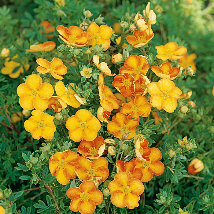 Листопадный кустарник с округлой плотной кроной. Изящные разрезные листочки зелено-голубые, с опушением. Оборотная сторона листьев – серебристая. Цветки оранжевые с медным напылением. Летом светлеют, становясь абрикосово-желтыми. Поэтому предпочтительнее выбирать для посадки участки с небольшим затенением