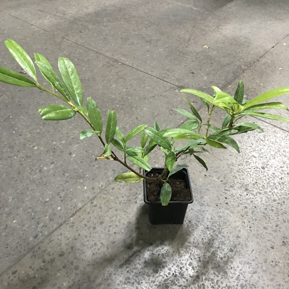 Низкий, раскидистый кустарник поднимается до 1 м в высоту, и 2,5 м в ширину. У него узкие блестящие темно-зеленого цвета листья, похожие на листья лавра.  Ветви растут почти горизонтально и формируют округлые подушкообразные кусты. Цветки белые, мелкие, очень ароматные, собраны в вертикальные соцветия, появляются в мае. Плоды-костянки темно окрашенные, декоративные, подолгу остаются на кусте. Растение легко переносит стрижку. В средней полосена на зиму требует укрытия.