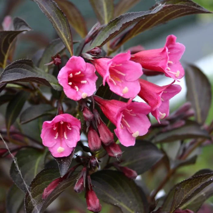 Вейгела Виктория отличается темной кожистой бронзово-пурпурной листвой. Кустарник растет медленно, максимальная высота 1,5-2 м. В конце весны распускаются красно-розовые колокольчатые цветки размером 4 см, собранные в небольшие кластеры по 3-4 шт. Они привлекают к себе бабочек и пчел. Первый месяц цветение обильное, потом становится более редким, но продолжается до сентября. Цветение проходит на побегах текущего года, поэтому декоративность кустарника проявится даже после особенно морозной зимы!