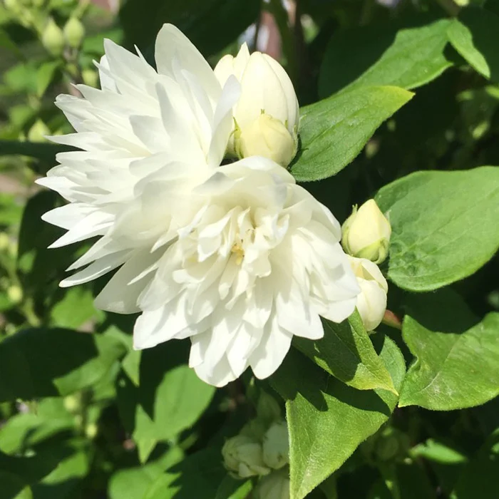 Компактный сорт с махровыми цветками. В первые годы после посадки формирует вертикальную крону, затем крона становится ассиметричной, а побеги поникающими. В июне-июле цветет махровыми ароматными цветками до 4 см в диаметре. Подходящий вариант для цветущей изгороди и ароматного облака под окнами дома. Неприхотлив, растет на любой садовой почве, не боится засухи и морозов. Цветочные почки формируются на прошлогодних побегах. Кустарник нуждается в ежегодной обрезке. Сразу после цветения побеги укорачиваем на треть (или две трети) длины, старые и больные побеги - до основания. Старые кусты омолаживают обрезкой на пень ранней весной до начала сокодвижения, оставляя пенек высотой 15-30 см.