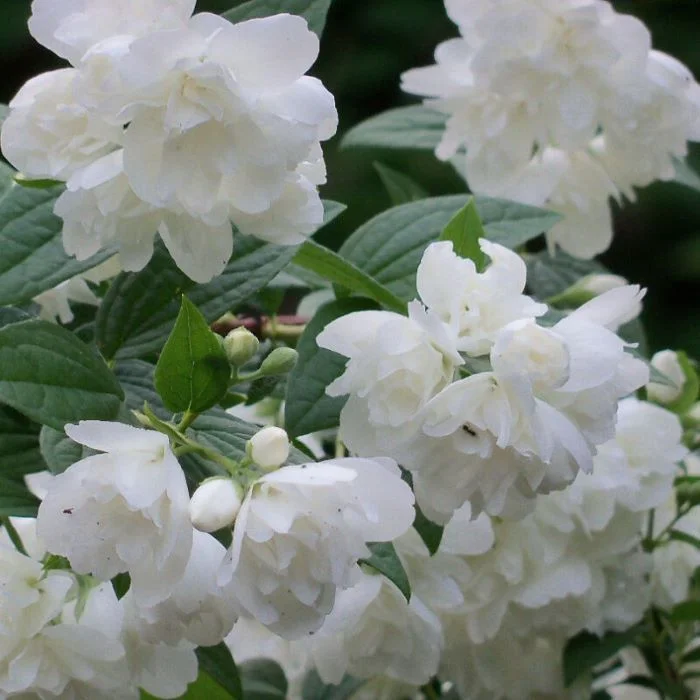 Компактный сорт. Цветки белоснежные, махровые, очень декоративные. Отличаются крупным размером: до 5 см в диаметре. Высота - до 150 см, ширина - до 120 см. Достигает зрелости примерно к 10-12 годам. Во время цветения стебли обильно покрыты бутонами. Может прижиться даже в полной тени, хотя цветение будет слабым. Растение неприхотливо и нуждается в стандартных мерах: полив в засушливое время, периодическое внесение удобрений, рыхление почвы. Листья летом темно-зеленые, а осенью желтеют. Форма удлиненная, на ветвях растут супротивно. Края зубчатые. Цветение происходит в июне, в некоторых регионах заканчивается в начале июля. Цветки источают приятный легкий аромат. Растение прекрасно смотрится как в групповых, так и в одиночных посадках, подходит для создания живых изгородей.  Популярен как у садоводов-любителей, так и у профессиональных ландшафтных дизайнеров из-за красивого цветения.