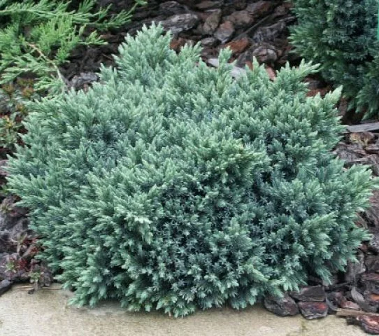 Кустарник высотой до 2 м и диаметром до 1,5 м (в Средней полосе России) с интересной ассиметричной, воронкообразной, раскидистой кроной и растущими косо вверх ветвями, концы побегов свисают вниз. Хвоя игольчатая, колючая, до 1 см длиной, густая, серебристо-голубая. Растет медленно.