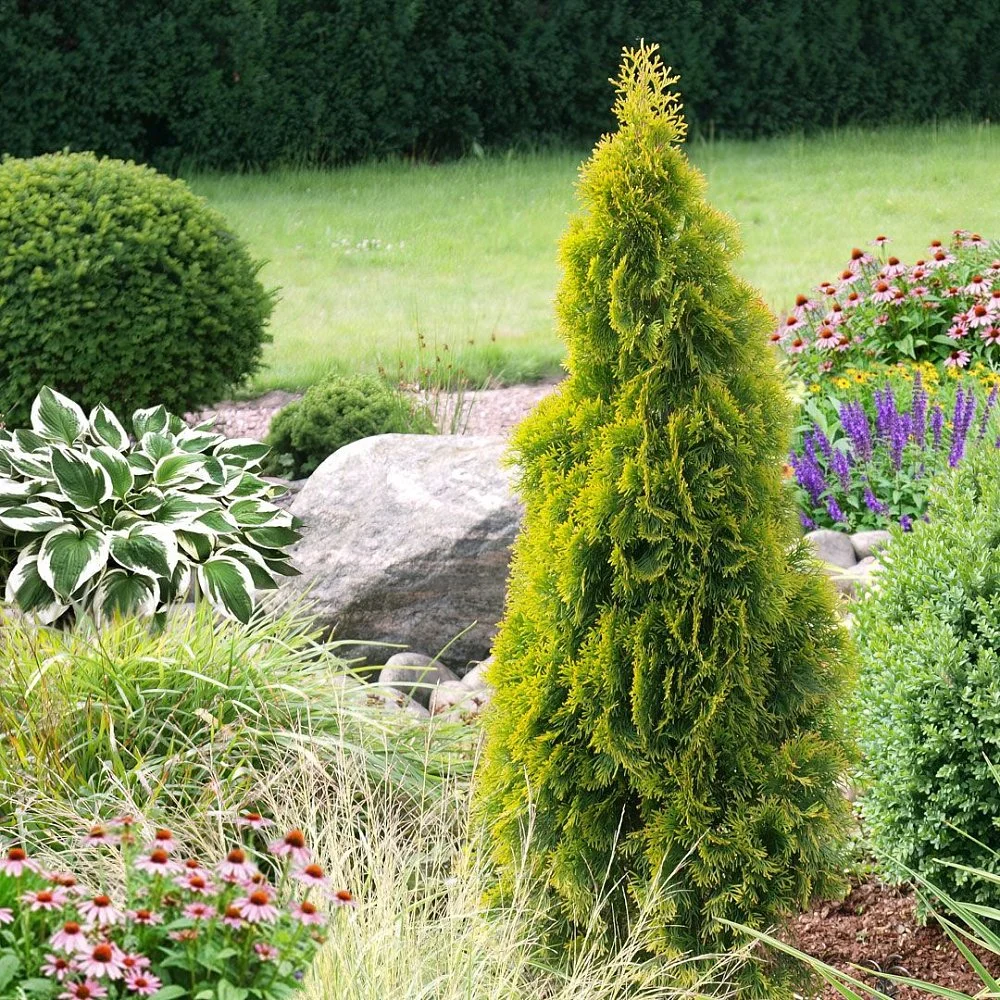 Если вы ищете нестандартное дерево для создания вертикального акцента на даче, рекомендуем присмотреться к этой туе. Хвойное дерево привлечёт не только золотистой окраской хвои, но и узко-конической формой кроны. Только представьте взмывающий вверх золотой столб! Высота взрослого медленнорастущего дерева 4-6 м. Для сохранения насыщенной золотистой окраски посадите дерево на открытом солнечном месте. Предпочтительный вариант садовой почвы - увлажнённые питательные суглинки. Туя неприхотлива, редко болеет. Для поддержания формы кроны стригите  дерево 2-3 раза в год. Санитарная обрезка - ранней весной (с марта по апрель) и осенью, а формирующая - с конца весны до середины лета (по июнь) и повторно в конце августа. Живописный солитёр и яркий элемент цветной живой изгороди.