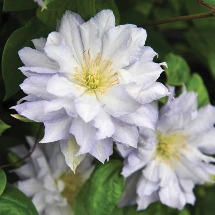 Цветки бело-голубые, махровые, шаровидные. Лепестки с острыми кончиками, слегка волнистые, с загнутыми вниз, более тёмными краями. Тычиночные нити кремовые, пыльники жёлтые. В июне –июле цветение очень обильное. Любит хорошо освещённые места. Особо красиво выглядит натёмном фоне.