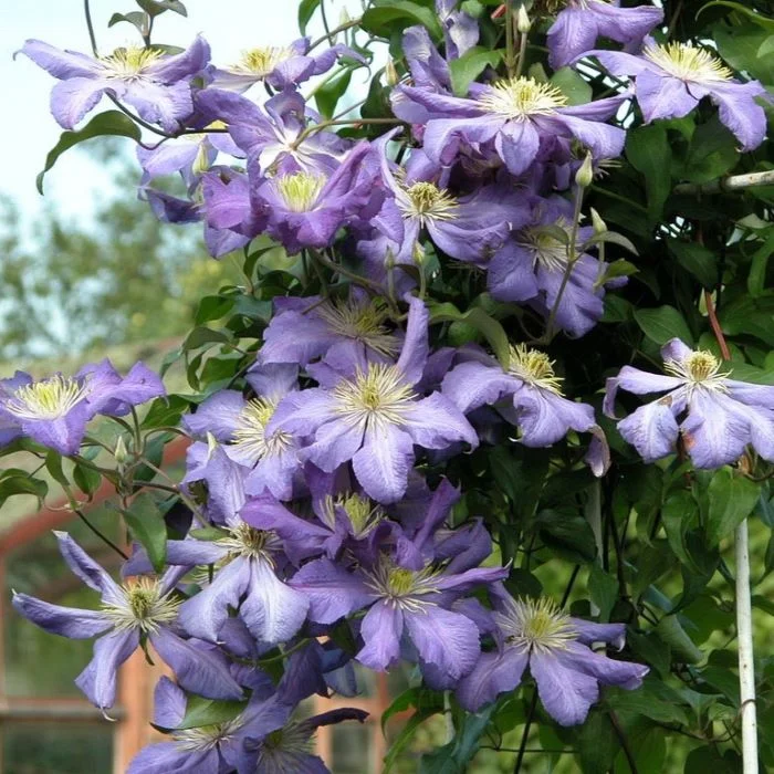 Мощный быстрорастущий сорт из группы Жакмана, предназначенный для вертикального озеленения: подходит для посадки у ограждений, пергол, беседок, небольших деревьев и стен. Растение формирует лиану высотой 2–3 м с крупными одиночными цветками диаметром 12–18 см. Цветки направлены вверх, состоят из 8 волнистых чашелистиков; их окраска меняется в зависимости от погоды — от лилово‑голубой до насыщенно‑фиолетовой, тычинки жёлтые. Цветение обильное, позднее — с июля по сентябрь. Сорт относится к 3‑й группе обрезки (требуется сильная ежегодная обрезка: после цветения удаляют старые и повреждённые побеги, оставшиеся подрезают до высоты 30–50 см). Отличается высокой морозостойкостью (выдерживает температуры до −35…−40 °C, зоны USDA 3–4) и устойчивостью к болезням. Для посадки выбирают солнечное или полутенистое место, защищённое от сквозняков (при этом корни должны быть в затенении, а стебли и цветы — на свету); почва нужна плодородная, дренированная, нейтральная или слабощелочная (pH 6–7). Полив умеренный, без застоя воды, особенно важен в период цветения. При посадке корневую шейку заглубляют на 5–10 см; необходима опора (решётка, шпалера и т. п.). В средней полосе России на зиму требуется укрытие, особенно в первые годы после посадки. Регулярное удаление отцветших соцветий стимулирует появление новых цветочных почек. Благодаря крупным цветкам и обильному цветению сорт хорошо подходит для создания живой изгороди.