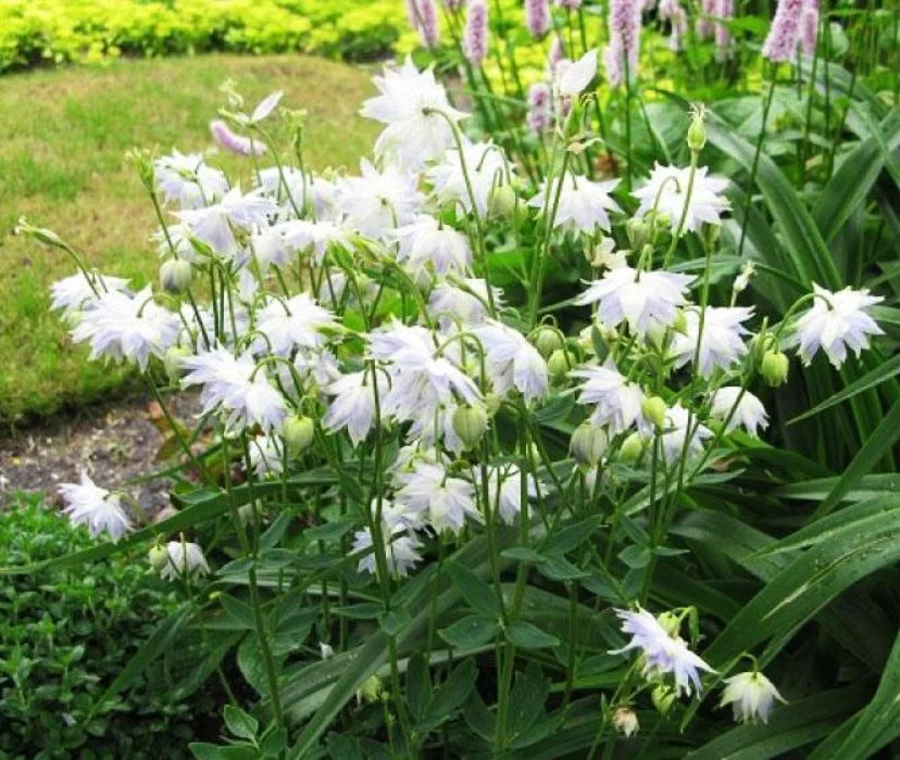 Аквилегия Барлоу цветёт белыми цветами, лепестки которых вытянуты в остроконечную форму. Они формируют сразу несколько рядов, поэтому визуально кажутся очень пышными. Лучше всего он будет сочетаться с розовыми гвоздиками и горечавками. Рекомендуем также посадить аквилегию в альпинарии! Её корневая система – стержневая, а потому даже в засушливые периоды она не засохнет, а выстоит безводные периоды в самом лучшем виде.