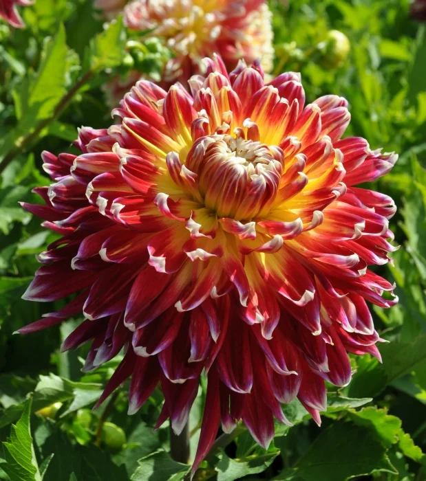 Этот великолепный сорт выведен японскими селекционерами в 1978 году. Специалисты относят георгины сорта Акита к смешанным, полукактусовым и декоративным сортам.
