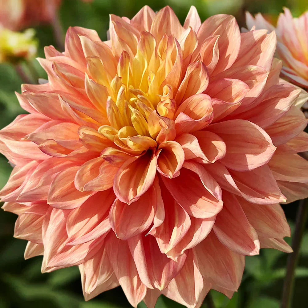 Соцветия этой декоративной георгины не редко достигают 25 см в диаметре! Сияющие цветки в оттенках жёлтого, персикового, оранжево-розового закружат в вихре оттенков летнего восхода солнца. Лепестки широкие, с волнистой фактурой, добавляющей соцветиям объёма, пышности и солнечного эффекта. Нежные композиции заднего плана, яркие акценты, интгригующие букеты.