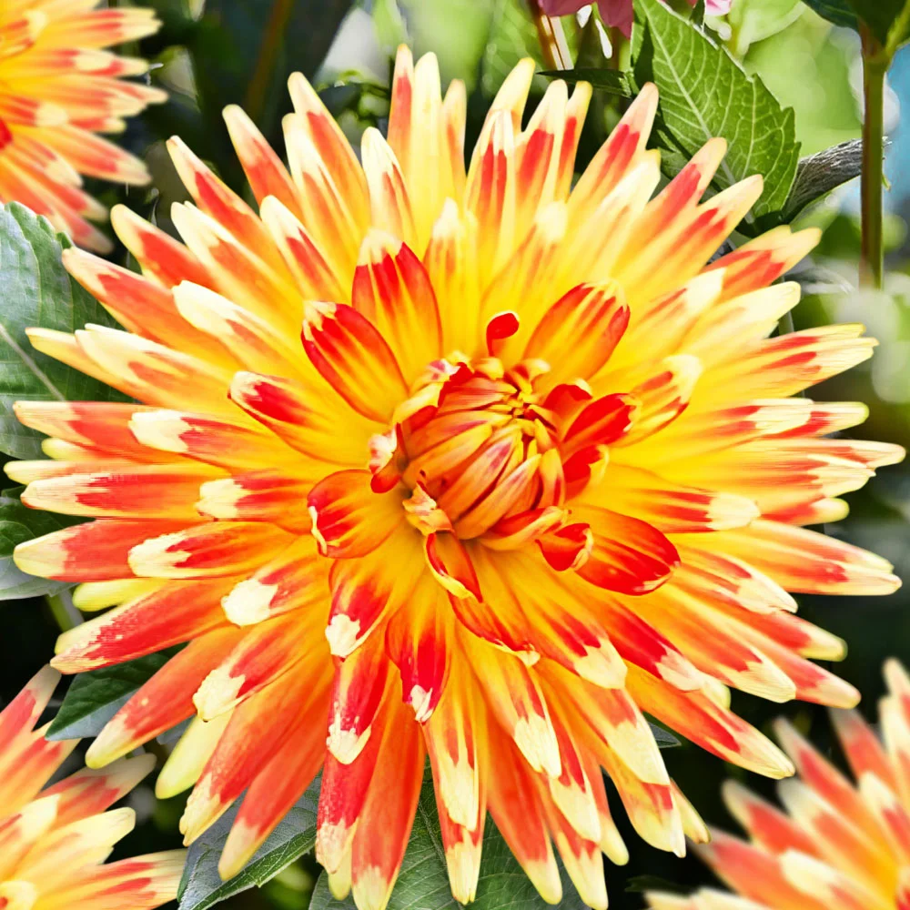 Восхитительные трёхцветные соцветия! Полукактусовые, махровые, до 15 см в диаметре. Основания лепестков золотисто-оранжевые, с мягкими переходами в красный. Кончики лепестков покрыты белоснежной сахарной глазурью. В эту георгину невозможно не влюбиться! Декоративные группы, бордюры и букеты с цветовыми переходами достойны восхищения.