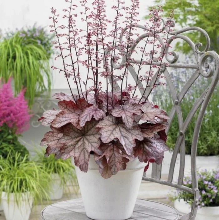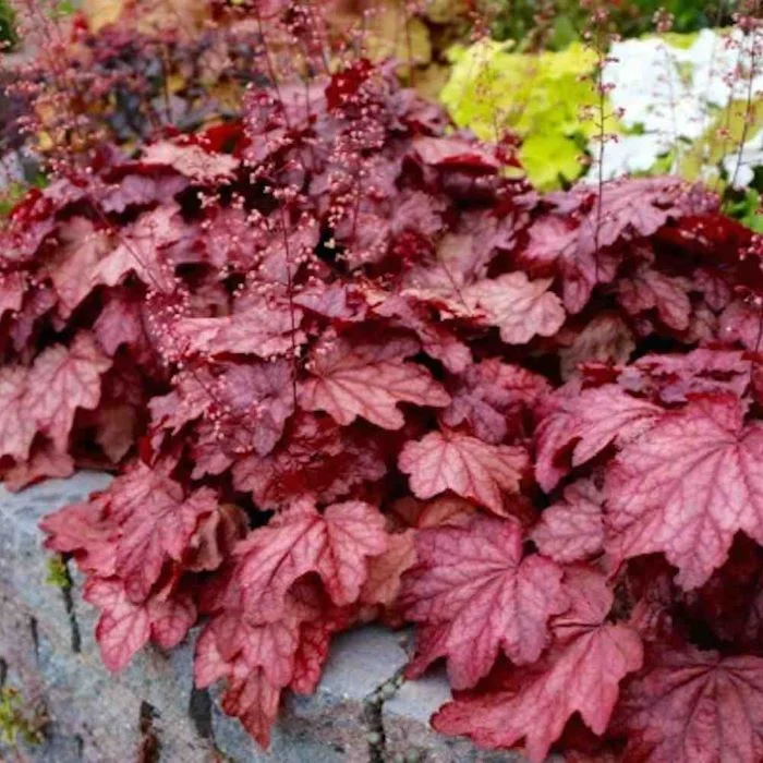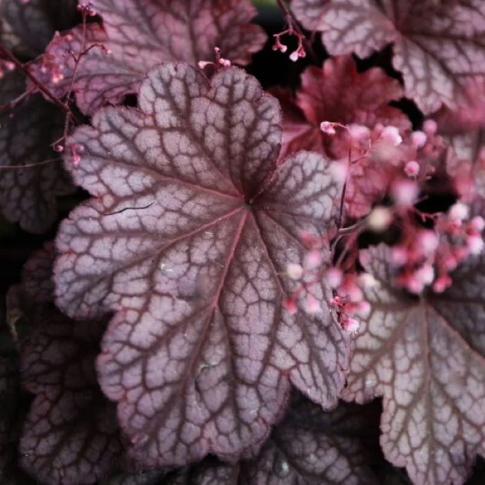 Многолетнее растение высотой 30-40 см с волнистыми листьями, меняющими окраску: весной - тёмно‑бордовые с пурпурными нотками, летом - насыщенные пурпурные с серебристым налётом. Цветёт с июня по август мелкими бело‑розовыми колокольчатыми цветками в воздушных метёлках. Предпочитает полутень, но выдерживает и солнце (в южных регионах возможен ожог листвы); требует дренированной плодородной почвы слабокислой или нейтральной реакции и умеренного полива без застоя воды. Морозостойка ( до −34 °C), на зиму молодые растения укрывают мульчей. Уход включает подкормки весной и во время цветения, удаление увядших соцветий, омоложение куста каждые 3–4 года делением. Устойчива к болезням, но при избыточной влажности может поражаться мучнистой росой и корневыми гнилями; из вредителей опасны тля и улитки. Подходит для бордюров, контейнеров, альпинариев и рокариев; при посадке важно не заглублять корневую шейку.
