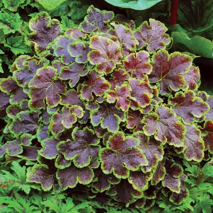 Гибридное декоративное растение высотой до 30 см, полученное скрещиванием гейхеры с тиареллой сердцелистной. Отличается округлыми зубчатыми листьями винно‑бордового цвета с яркой жёлто‑зелёной волнистой каймой, сохраняющей насыщенность до снега. Цветёт в мае–июне белыми цветками в метельчатых соцветиях (до 10 см) на цветоносах высотой до 40 см. Предпочитает полутень или места с утренним солнцем (в полной тени окраска бледнеет); требует рыхлой, хорошо дренированной нейтральной почвы и регулярного умеренного полива без застоя воды. Морозостойка, выдерживает до −35 °C, но на зиму рекомендуется укрывать нетканым материалом. При посадке корневая шейка должна оставаться на уровне земли, расстояние между растениями - 30–40 см. Уход включает весеннюю подкормку минеральными удобрениями, органику в течение сезона, обрезку старых листьев и отцветших соцветий, мульчирование осенью. Раз в 3 года требуется деление куста для омоложения. Подходит для миксбордеров, бордюров, каменистых садов и групповых посадок, хорошо сочетается с хвойными и растениями красных и синих тонов. Может поражаться слизнями, но в целом устойчива к болезням при соблюдении агротехники.