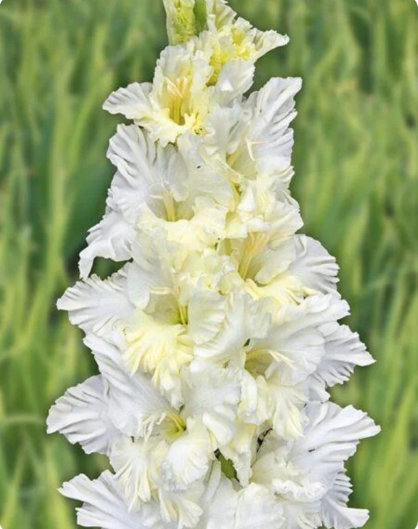 Гладиолус Сын луны - Снежно белый окрас цветов, сильно гофрированные, с многочисленными праздничными складками и защипами по краям лепестков, плотно уложенный колос на высоком цветоносе. (500, о, Фотин)
