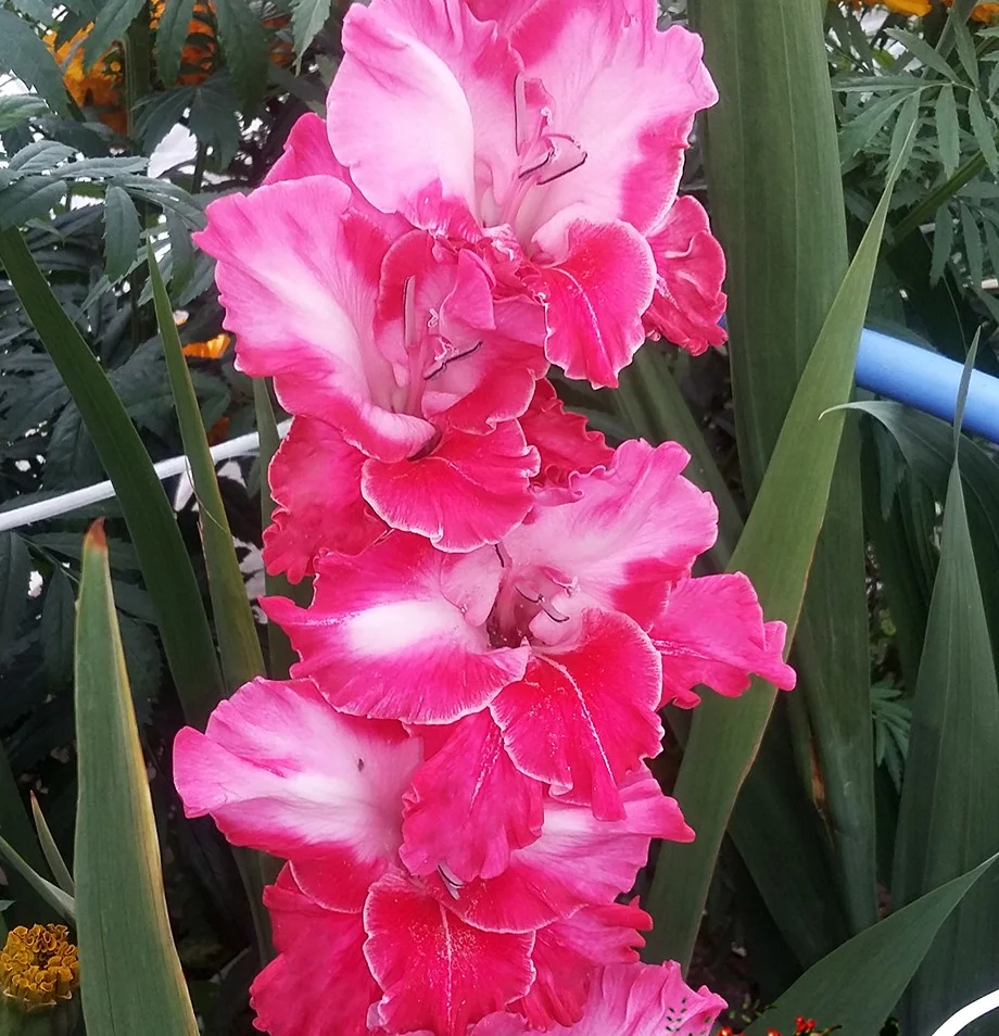 Ярко-малиновый с высветлением в горле, нижний лепесток насыщенный тёмно-малиновый с тонкой белой стрелкой и каймой по контуру. Цветки размером 11,5-14 см, глубоко гофрированные складками по краю лепестков. Фактура лепестков плотная. В соцветии может быть 9 одновременно открытых цветков из 23. Срок цветения ранний. Отличная срезка.