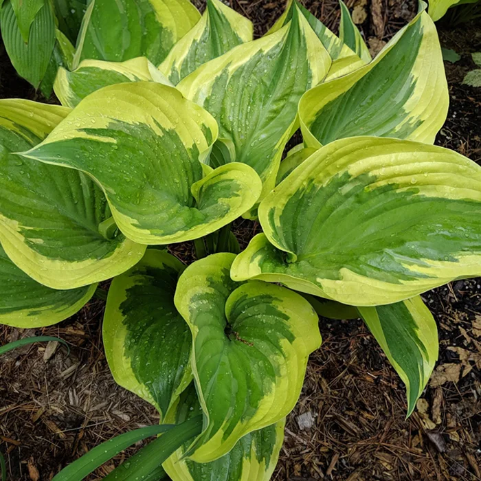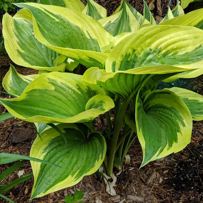 Мимо этой красавицы невозможно пройти в саду! Крупные выразительные листья как будто сделаны из кожи. Фактурные, с глубокими прожилками, гладкие и глянцевые. Тёмно-зеленый лист украшен широкой кремово-белой каймой по волнистому краю. К концу сезона цвет каймы становится молочно-сливочным. Во второй половине лета цветёт очень бледными сиреневыми, практически белыми цветками. Через несколько лет сформирует эффектную плотную насыпь из пёстрых листьев. Нарастает – медленно.