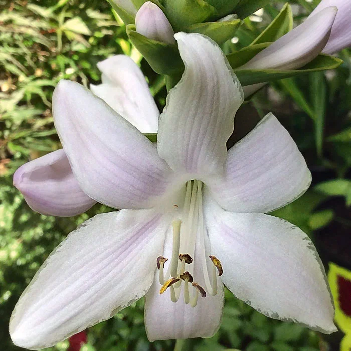 Обладает более тёмными и зелёными листьями по сравнению с известной хостой Фрагрант Букет. Края листьев украшены светлой каймой. Весной кайма золотистая, а летом – белая. Быстро нарастающий сорт отлично растёт на открытом солнце. К концу лета цветёт крупными белыми цветками со сладковатым ароматом. Куст сохраняет привлекательность до морозов. (К-7/3 Z4)