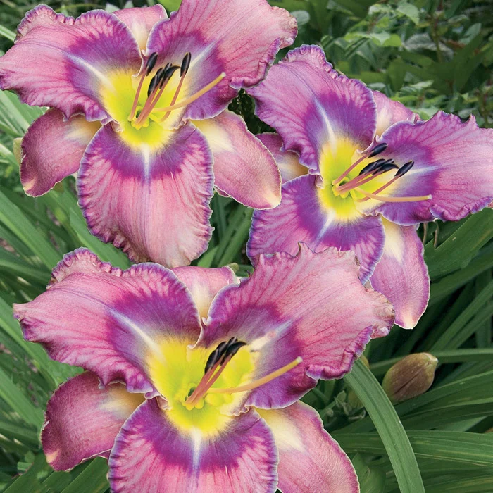Лилейник Милдред Митчел - красочный сорт с яркими ароматными цветами! Специально для торжественных центральных посадок, создания уютной приятной атмосферы и хорошего настроения! Цветы лилейника Милдред Митчел очень крупные: их диаметр составляет 16 см! Они расписаны в сиреневых тонах: центральные части лепестка представлены в насыщенно фиолетовом цвете (при этом не тёмном!), а ближе к краям интенсивность окраски уменьшается. По краю лепестков идёт мелкая рифлёность, при этом сначала окантовка сиреневая, а потом белая. Горло широкое, лимонно-жёлтое. Тычинки и пестик также крупные и длинные, идеально дополняют крупный цветок лилейника.