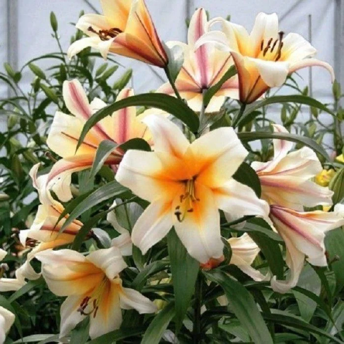 Этот прекрасный сорт порадует вас своим цветением в середине-конце лета. Время, от посадки до цветения, составляет около 90 дней. Иногда требуют опоры.OT лилии гибриды – это новая группа лилий, которые получены в результате скрещивания восточных лилий (Oriental Lilies) и трубчатых лилий (Trumpet Lilies). Они добавят в сад гламура! Эти лилии имеют исключительно ароматные цветки, как их родители восточные лилии, и большие толстые лепестки, как трубчатые лилии. От других видов эти растения отличаются сильным ростом и прочными побегами, морозостойкостью, устойчивостью к болезням. Их цветки очень крупные, широкочашевидные или воронковидные. Их размер – до 17-25 см в диаметре. Окраска цветков – белая, желтая, розовая, оранжевая, красная или многоцветная. Цветки смотрят в стороны, вверх или вниз. В основном эти лилии используют для круглогодичной выгонки и срезки. Высота растений составляет 90-180 см. Поэтому каждую лилию из этой группы часто называют «Лилейным деревом».