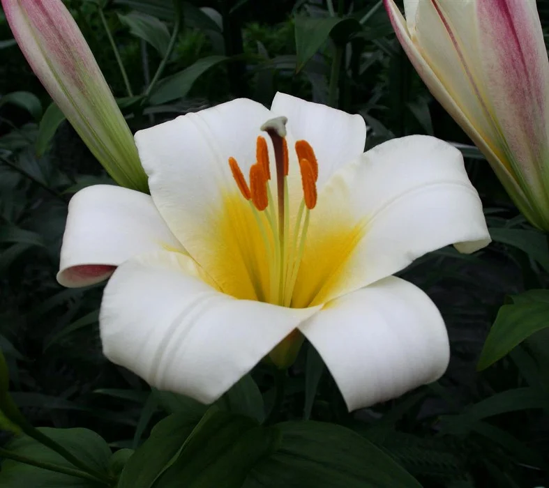Смотрящие вверх цветки 18 см в диаметре с насыщенным ароматом! Бутонов так много, так что одна срезанная лилия - готовый букет!  Белые и плотные лепестки с позолотой у основания. Снаружи украшены розово-шоколадными штрихами. Лилия для великолепных букетов и королевского украшения цветника!