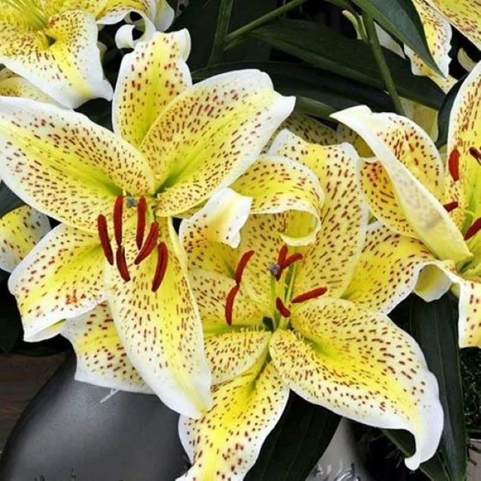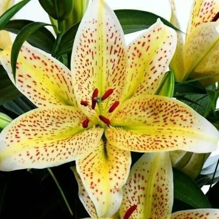 Восточный гибрид высотой 100–130 см с крупными цветками диаметром 20–25 см. Её кремовые или белые лепестки украшены жёлтой продольной полосой по центру и частым бордовым или тёмно‑красным крапом; лепестки слегка волнистые, а аромат - сладкий и насыщенный. Цветение приходится на июль–август. Для посадки выбирают солнечное или слегка затенённое место на небольшом возвышении (чтобы избежать застоя воды), защищённое от ветра; почва должна быть плодородной, слабокислой, рыхлой, песчано‑глинистой, известкованной. Луковицы высаживают осенью (август–сентябрь) или весной (конец апреля — май) на глубину 10–15 см. Уход включает умеренный полив под корень, поддержание почвы в рыхлом состоянии, подкормки (однократно после цветения, если перед посадкой удобрения уже вносили), мульчирование и удаление засохших бутонов; высокорослые стебли рекомендуется подвязывать. Лилия подходит для групповых и одиночных посадок, миксбордеров, клумб, а также для срезки.