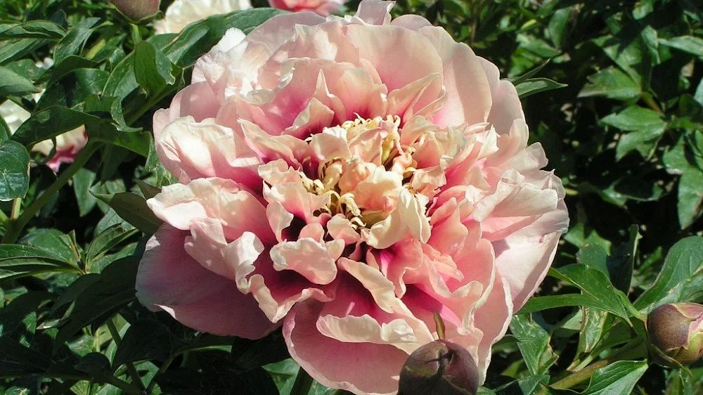 Цветок большой, розовый до розово-лососёвого с более тёмными пятнами в основании лепестков. Листва пышная. Стебли сильные, вертикальные. На цветоносах по 3-5 бутонов.