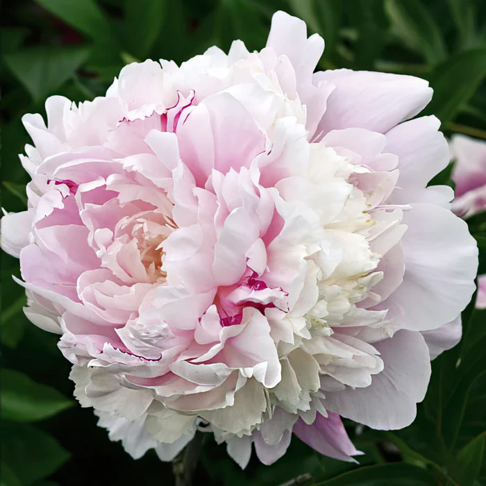 Прекрасные цветы для украшения сада и самого изысканного романтического букета! Многоярусные и розовидные, они обязательно обратят на себя внимание. Внешние лепестки широкие и округлые, нежно-розовые с легким серебрением. Центр высокий из розовых лепестков, окруженных золотисто-сливочным поясом. Центральные лепестки иногда украшены малиновым кантом. Часто высота цветка превышает его диаметр. Чудесные взбитые сливки с нежным ягодным суфле. Цветки отлично держат форму, куст не разваливается.