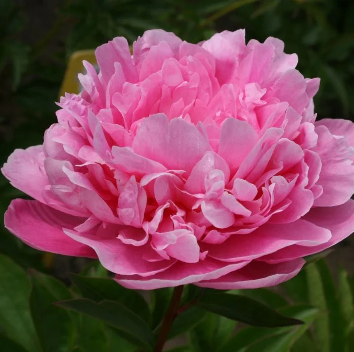 Цветки диаметром 16 см, махровые, компактные, сверкающего тёмно-розового цвета. Изобилие многочисленных рядов больших лепестков придают цветку форму пышного полушара. Имеют слабый аромат.