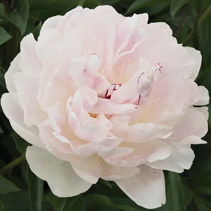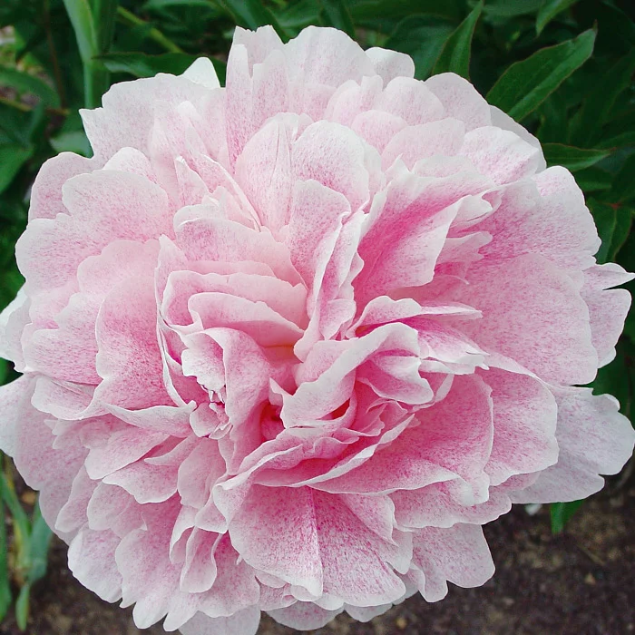 Эксклюзивный и редкий сорт! Махровые цветки красивой формы издали кажутся розовыми, но при ближайшем рассмотрении обнаруживается, что лепестки белоснежные. Оказывется они равномерно покрыты мельчайшими малиновыми крапинками и брызгами. Цветки с оригинальной окраской оживят многолетние цветники и удивят гостей.