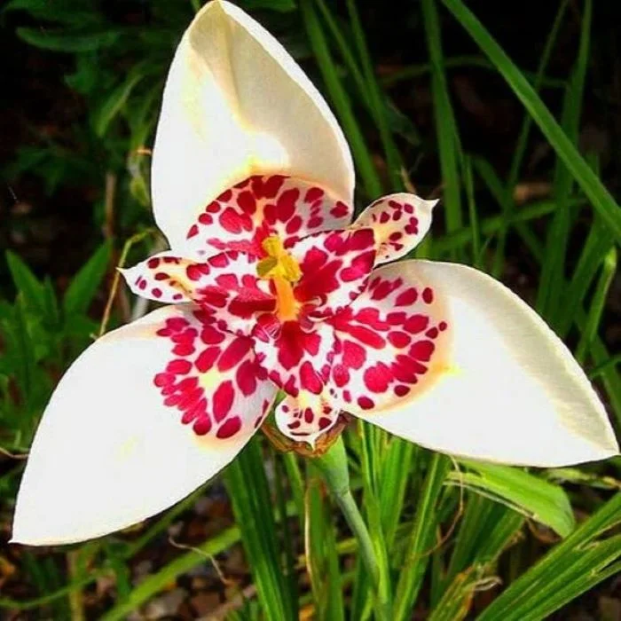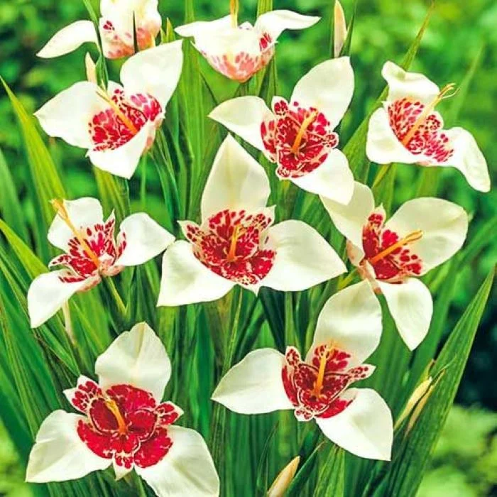 Клубнелуковичное растение высотой до 45 см с эффектными цветками диаметром до 15 см, напоминающими миниатюрные орхидеи: белоснежные лепестки дополнены яркой пятнистой бордовой серединкой. На одном растении - 3–5 цветоносов, каждый несёт до 5 бутонов, которые раскрываются поочерёдно. Цветение приходится на июль–август; при этом один цветок живёт 8–10 часов, а общий период цветения длится 15–25 дней. Растение имеет крепкие стебли (не требующие подвязки) и мечевидные светло‑зелёные листья. Для посадки выбирают солнечное, защищённое от ветра место с лёгкой, рыхлой, удобренной, хорошо дренированной, некислой почвой; луковицы высаживают в конце мая - начале июня на глубину 5–10 см (для более раннего цветения можно предварительно подрастить их в комнате). Уход схож с уходом за гладиолусами: необходимы минеральные подкормки и своевременный полив (особенно в жару). Зимостойкость низкая - клубнелуковицы обязательно выкапывают до заморозков. Тигридию используют в групповых посадках и бордюрах; она эффектно смотрится на фоне хвойных, около водоёмов или камней, а также на газоне или среди почвопокровных растений.