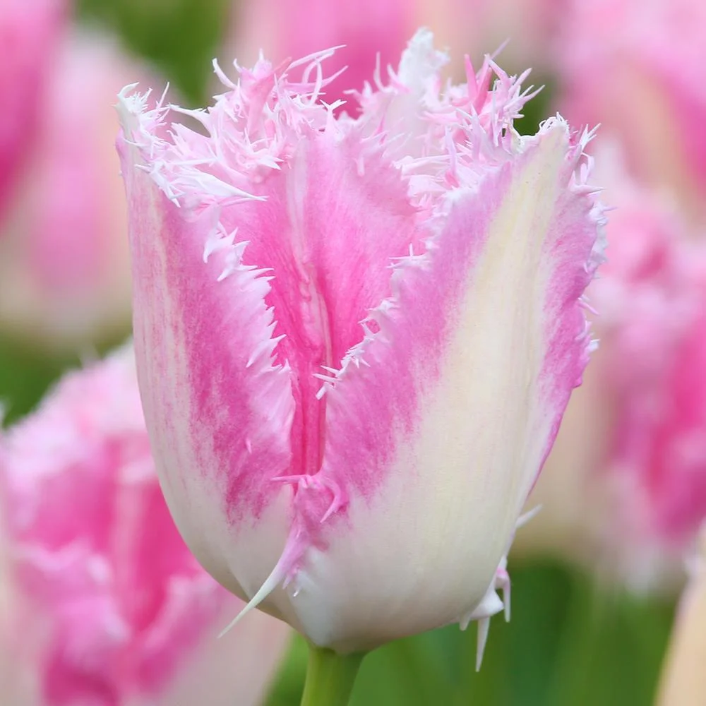 Цветок бокаловидный, крупный. Окраска лепестков снаружи кремово-белая с широкой сиренево-розовой каймой и бело-розовой густой игольчатой бахромой.