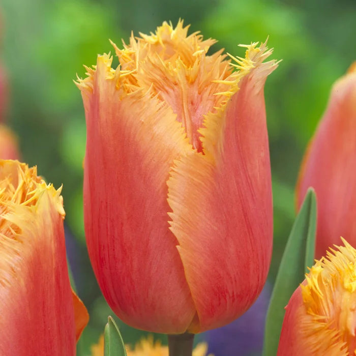 Tulipa «Lambada», 1991 г, класс бахромчатые тюльпаны. «Ламбада» крупный светло-оранжево-красный тюльпан бокаловидной формы, высотой 7 см, с желтоватой каймой переходящей в густую бахрому. Наружные стенки лепестков подсвечены розовым. Внутри «Ламбада» шафранно-желтого цвета. Дно канареечно-желтое с зеленым окаймлением. Бахрома ярко выраженная, зубчатая, насыщенно желтая. Общее цветовое впечатление очень теплое, яркое, нарядное. Высота 50-70 см.