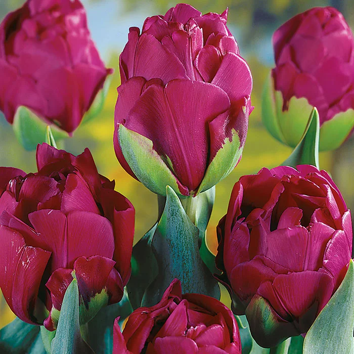 Тюльпан Абигейл – словно весенняя роза! Нераспустившиеся тюльпаны действительно напоминают царицу сада, особенно эффект усиливается благодаря цветовому оформлению лепестков. Цветы пионовидные, супермахровый. Относятся к позднему периоду весеннего цветения. В полном роспуске бокал достигает диаметра 11  см! Изящные волнистые лепестки насыщенного малиново-пурпурного цвета с ярко-зелеными пазухами выглядят необычно и ярко. В вечернем рассеянном свете они окрашиваются в страстный ярко-красный оттенок!
