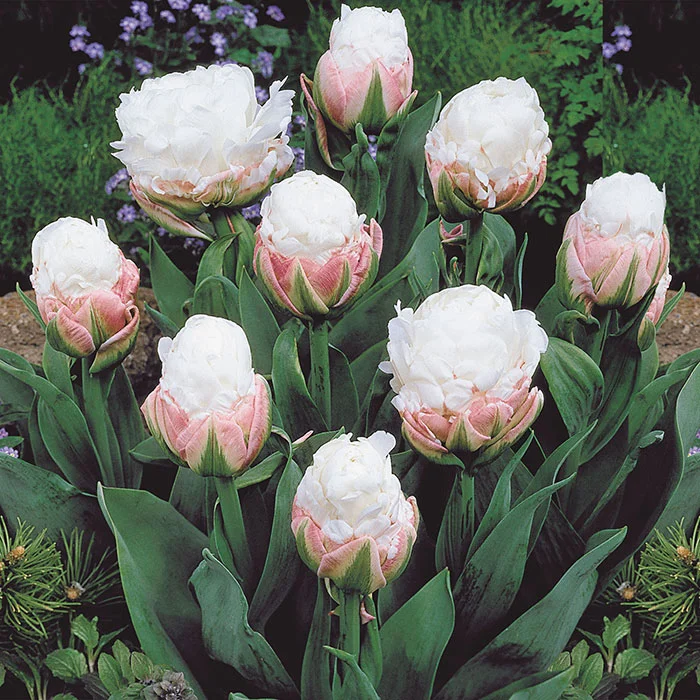 Тюльпан Айс Крим – рекордсмены по пышности, оригинальности окраски и длительности цветения! Поздние махровые тюльпаны имеют тяжелые густомахровые цветки, внешне напоминающие садовые пионы, поэтому их часто называют пионовидными. Это довольно высокое растение с цветоносами от 40 см и диаметром цветка 10 см. Тюльпаны этой группы отличаются длительным периодом цветения, около 3 недель, долго не увядают в срезке. Благодаря своей необычной форме, махровые поздние тюльпаны выглядят свежо и необычно в декоративных посадках, а также хорошо подходят для выгонки! А так как сорт Айс Крим вам точно понравится, то вопрос выгонки встанет совсем скоро.