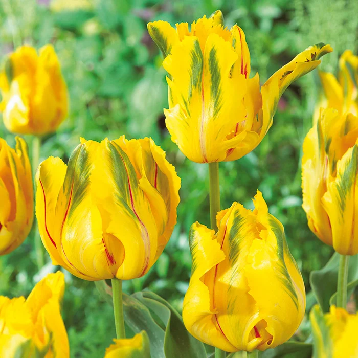 Невероятно! Один из самых высоких и крупных попугайных тюльпанов, когда-либо встречающихся в саду! Необычный яркий жёлтый окрас цветков с огненно-красным узором просто завораживает. Сорт имеет крепкие стебли и очень устойчив к ветру и непогоде. Идеально сочетается с тюльпаном Мэрилин.