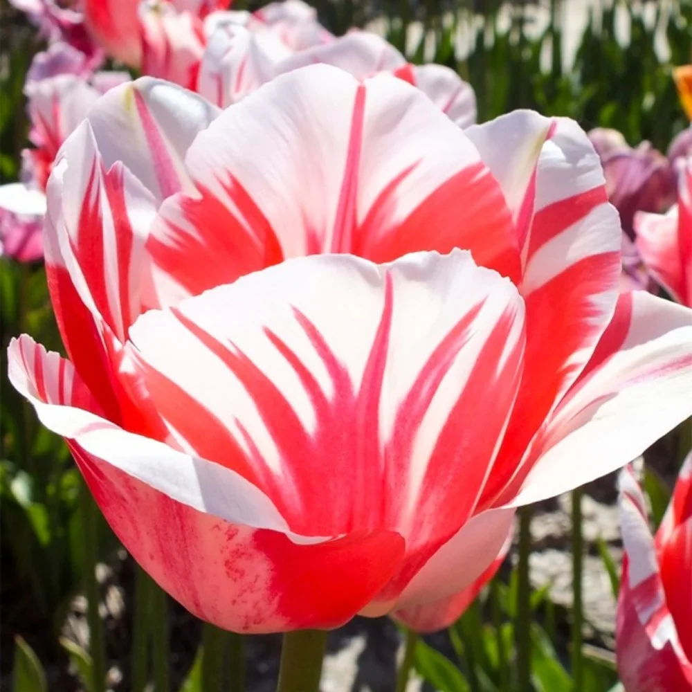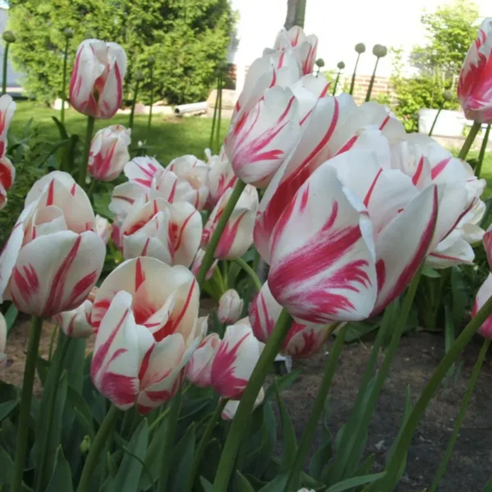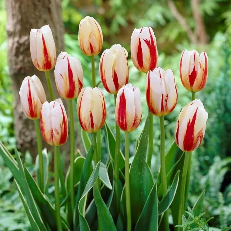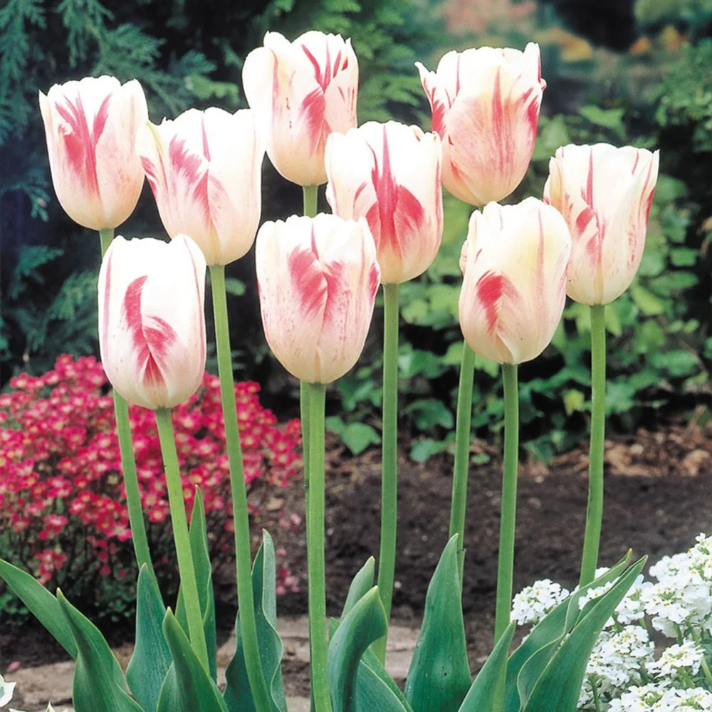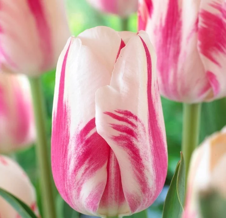 Тюльпан Сорбет является представителем класса простых поздних тюльпанов. К тому же его относят к так называемым тюльпанам Рембрандта. Эти цветки очень высокорослые – цветонос иногда дорастает до 75 см. На кремово-розовом фоне находятся розово-фиолетовые мазки. Форма бокаловидная.