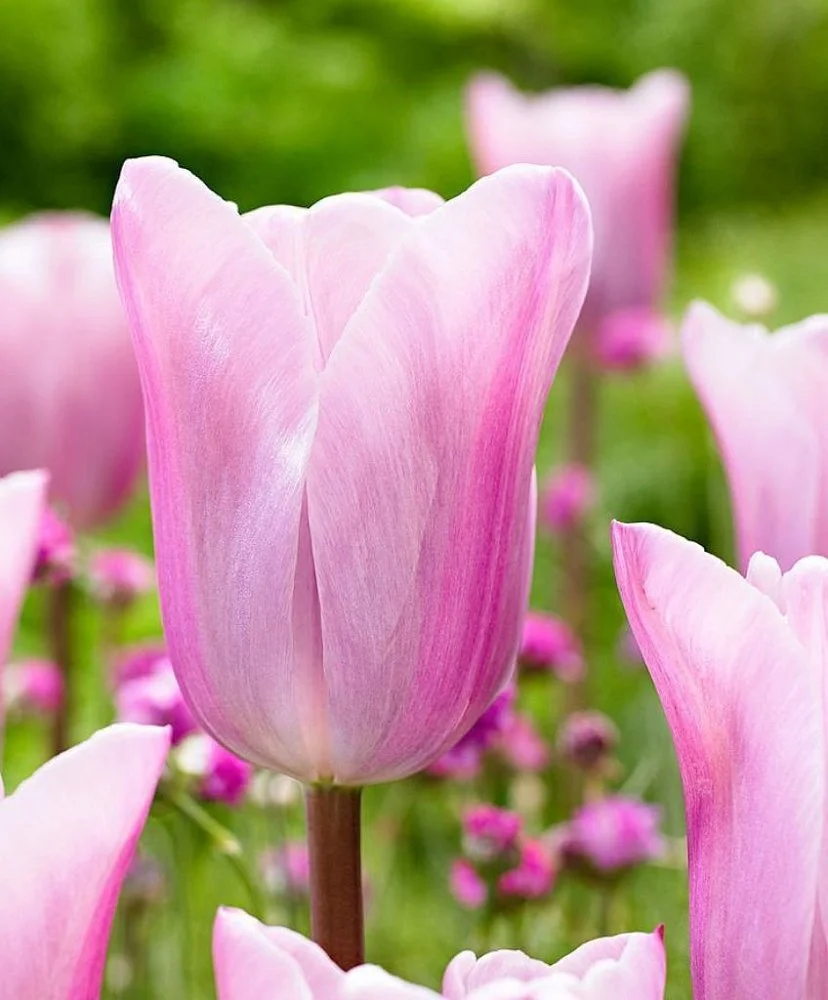 Это среднерослое растение высотой 50–60 см с крепким стеблем и насыщенно-зелёной листвой. Его главное украшение - крупные бокаловидные цветки вытянутой формы, достигающие 9 см в диаметре и 8–9 см в высоту. Лепестки окрашены в яркий розово-лиловый оттенок, аккуратные и немахровые, с лёгким ароматом. Цветы долго сохраняют свежесть в срезке, что делает их популярными для букетов. Растение предпочитает солнечные, защищённые от ветра участки, но может расти и в лёгкой тени. Оптимальны нейтральные почвы - лёгкие суглинистые или песчаные, с хорошим дренажем. Сорт отличается высокой зимостойкостью (зона USDA 3, до -40°C). Цветение наступает в апреле-мае, относится к среднецветущим. Благодаря яркой окраске и элегантной форме, «Мистресс» эффектно смотрится в групповых посадках на клумбах, в миксбордерах или в качестве акцента в садовых композициях.