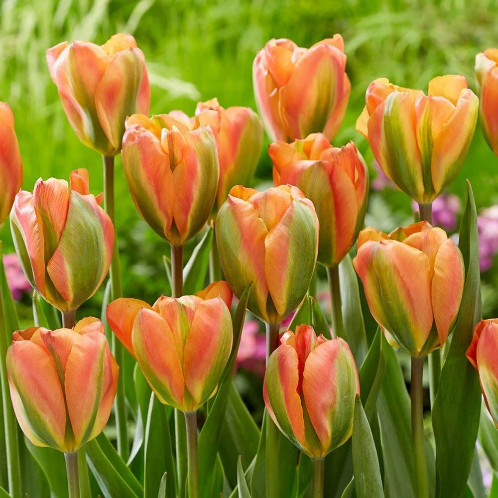 Тюльпан Оранж Мармелад относится к зеленоцветковым сортам из-за характерной полоски на его лепестках, которая сохраняется в течение всего периода цветения. Прекрасный оранжевый цвет с зелёными штрихами переходящий в оранжево-розовый край завораживает,особенно при мягком утреннем и вечернем свете. Зеленоцветковые тюльпаны цветут гораздо дольше остальных видов - где-то дней на 10 дольше, так как лепестки благодаря наличию зеленой окраски в какой-то степени выполняют функцию листьев. Высота цветоносов достигает 50 см, а размер цветка -  5–10 см. Пестрота расцветки прекрасно впишется в каменистый ландшафт альпинария, колоритно расцветив его яркими красками.