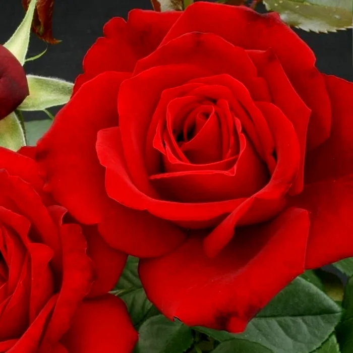 Чайно-гибридная роза с сильным ароматом. Бархатные лепестки оранжево-красные. Цветок махровый, до 28 лепестков. Цветет в течение всего сезона. Куст высокий, прямостоячий.