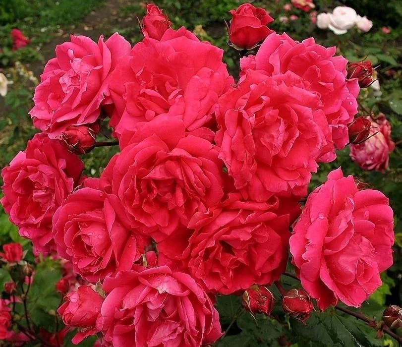 Роза канадская парковая Александр Маккензи – куст прямостоячий, высотой до 200 см, с изящно поникающими побегами. Листва крупная, блестящая. Цветки яркого красного цвета, махровые в больших кистях по 5-15 цветков. Лепестки постепенно выгорают до темного розового цвета. Аромат легкий, слегка пахнет свежей клубникой. Повторноцветущий сорт.