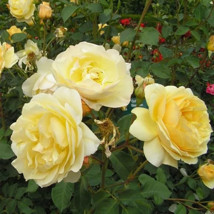 Плетистая роза с позолоченными цветками. Диаметр многослойного душистого цветка из 40-50 лепестков 10-11 см. Розы распускаются в небольших соцветиях-кистях. Элегантные крупные цветки на длинных стеблях, идеальны для срезки! Раскрываются ярко-желтыми, затем «выгорают» до лимонных, а по краям становятся кремовыми. Оборотная сторона лепестков на тон темнее. Процесс распускания конусовидных бутонов превращается в своеобразную игру света и тени. Цветение однократное, изредка цветёт повторно.