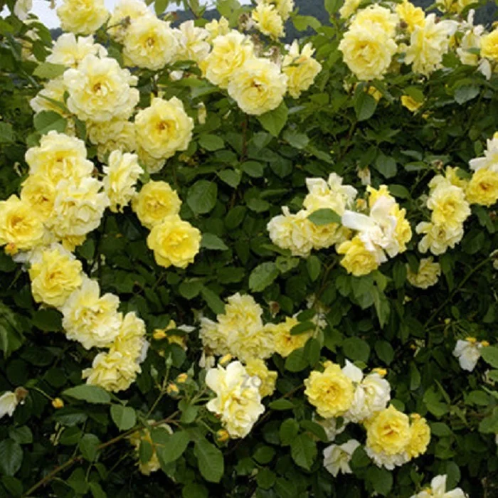 Плетистая роза с позолоченными цветками. Диаметр многослойного душистого цветка из 40-50 лепестков 10-11 см. Розы распускаются в небольших соцветиях-кистях. Элегантные крупные цветки на длинных стеблях, идеальны для срезки! Раскрываются ярко-желтыми, затем «выгорают» до лимонных, а по краям становятся кремовыми. Оборотная сторона лепестков на тон темнее. Процесс распускания конусовидных бутонов превращается в своеобразную игру света и тени. Цветение однократное, изредка цветёт повторно.