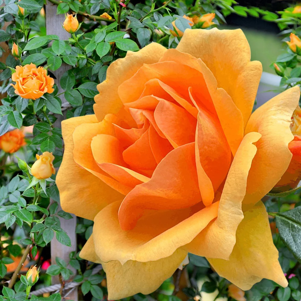 Плетистая роза с апельсиновыми махровыми цветками превратит ваш сад в Райский уголок. Арка, усыпанная оранжевыми цветками гармонично смотрится у входа на садовый участок, задекорирует беседку, деликатно спрячет от глаз уголок отдыха. Цветки с лёгким ароматом появляются в две волны. Сначала массово распускаются вначале лета, а зетем - одиночно до конца сезона цветения.
