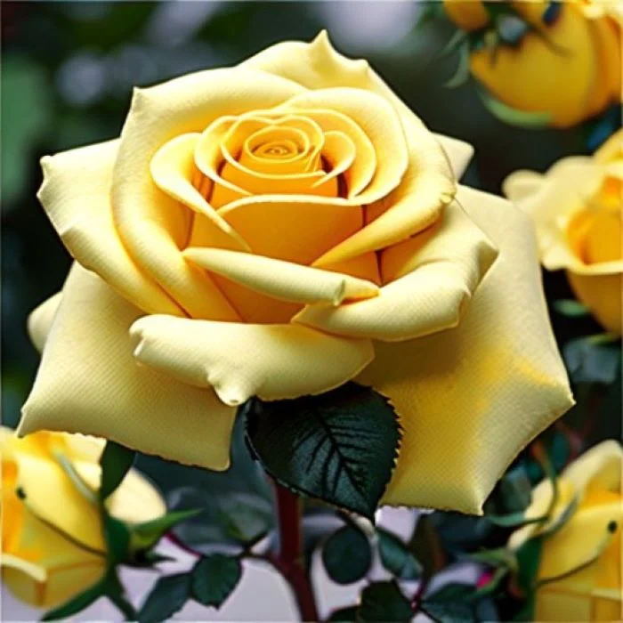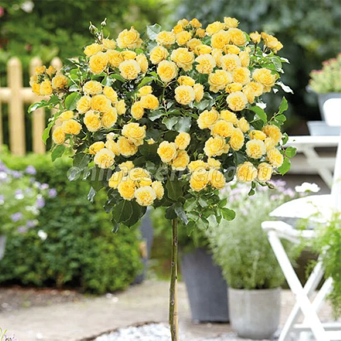 Штамбовая форма, полученная прививкой культурного сорта на стебель шиповника; представляет собой изящное деревце с голым стволиком и пышной кроной. В зависимости от высоты прививки может быть карликовой (30–50 см), средней (50–80 см), стандартной (80–150 см) или высокой (свыше 150 см). Цветки многочисленные, жёлтые, махровые (17–25 лепестков), диаметром 5 см; листва глянцевая, тёмно‑зелёная. Цветение обильное, двумя волнами с июня по сентябрь; в южных регионах возможна третья волна. Сорт устойчив к затяжным дождям, отличается хорошей формоустойчивостью. Зимостойкость соответствует 6‑й зоне (от −17,8 °C до −23,3 °C), требует обязательного укрытия на зиму в средней полосе и севернее. Подходит для одиночных и групповых посадок в саду, ярусных композиций, выращивания в контейнерах на балконах, террасах и в зимних садах. Для формирования правильной чашевидной кроны требуется не менее трёх лет ухода, включая регулярное удаление дикой поросли ниже места прививки.