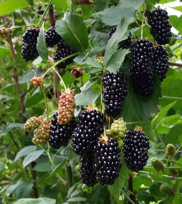 Блэк Бутте предстаёт как мощный и раскидистый кустарник, высотой до 1,5 м. Корневая система у него мощная, разветвлённая, мочковатого типа, не даёт прикорневую паросль. Побеги у куста стелющегося типа, достаточно гибкие, длиной до 3–4 м. Каждый из них покрыт мелкими черешковыми шипами, чёрного цвета, а также гофрированными, тёмно-зелёными листьями, собранными в трилистник. Количество ветвей на каждом кусте не превышает 6 штук, при этом плодоносит побег только на второй год развития.Ягоды у этого гибрида отличаются особо крупными размерами, длина плодов доходит до 5 см. Форма у среднестатистического плода вытянутая, цилидрическо-конусообразного типа, цвет мякоти чёрный. Вкус плодов насыщенный, хорошо выраженный, ягоды достаточна сладкие и отличаются умеренной кислинкой. Мякоть у спелых плодов отличается упругостью, умеренной сочностью, а также довольно сильным ароматом. При соблюдении правильной технологии выращивания ягоды приобретают хорошую лёжкость, что позволяет успешно транспортировать их на длительные расстояния.