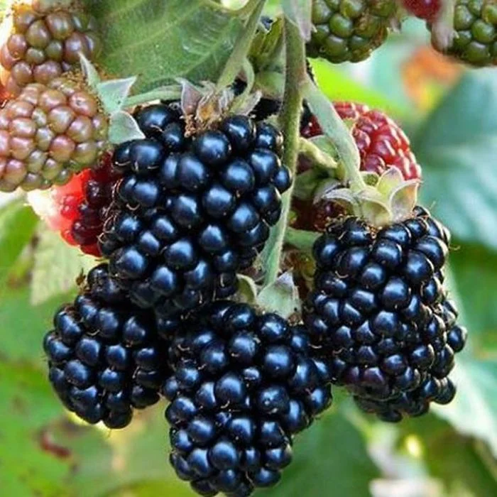 Ежевика как вид попала в Европу из Америки и долгое время росла как дикорастущая культура, но французские селекционеры не смогли пройти мимо ягод и решили преобразовать их. Ежевика Джамбо является гибридом, который выведен во Франции в питомнике Marionette в 2007 году. За основу родительской пары были взяты дикие сорта. Кусты растут компактно, лозы не стелятся в разные стороны, в высоту могут достигать 1,5-2 м. Ветви прямостоячие, без шипов. Но со временем под весом плодов начинают потихоньку наклоняться к земле. Важно продумывать систему шпалер. За один сезон куст дает побегов от 2 до 4 штук, их высота не более 50 см. Листья темно-зеленого оттенка, ближе к овальной форме, размер средний, на всей поверхности листвы есть прожилки, а по краям характерные зазубрины. К минусам можно отнести то, что эта культура совершенно не переносит сырость и холод. А также у нее продолжительная акклиматизация к месту посадки. Молодые саженцы могут долго не пускать новые побеги и не уходить в рост. Ежевика Джамбо относится к среднеспелому сорту. В южных регионах страны начинает созревать на второй неделе июля. В центральной части – в начале августа, а вот северных частях страны – ближе к концу августа. Так как вегетативный период довольно длительный, на кусте можно увидеть как набравшие цвет ягоды, так и ещё не начавшие распускаться цветы. В первый год от саженцев ждать урожая не стоит, так как ветки только пускают корни и приживаются к новому мест, а вот на следующий год урожайность не заставит себя ждать. Плодоношение занимает период до 6-8 недель, и с одного куста собирается 25-30 кг плодов. Ежевика своими плодами очень похожа на малину, поэтому по незнанию многие путают ежевику с черным сортом малины. Но это немного не так. Ягоды ежевики, в частности, сорта Джамбо, очень сладкие, в них не присутствует горечь или кислинка. Мякоть сочная, упругая. Костянки практически не ощущаются. Кожица нежная, но не лопается. Плоды не мнутся при сборе, а также при транспортировке. Срок хранения вне холода составляет 1-2 недели. Хорошо переносят заморозку, не теряя своих качеств. Цвет ягод черный, с небольшим глянцем. Вес первых ягод достигает 30 г, последующие ягоды могу весить в среднем 15 г.