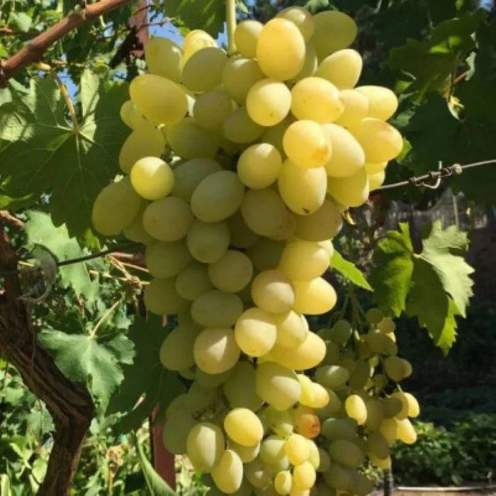 Гибридный столовый сорт раннего или среднераннего срока созревания (110–115 дней), выведен отечественным селекционером В. Н. Крайновым путём скрещивания сортов «Талисман» и «Кишмиш лучистый». Куст сильнорослый, с обоеполыми цветками. Грозди крупные или очень крупные (0,8–1,2 кг, отдельные - до 2–3 кг), цилиндрической или удлинённо‑конической формы. Ягоды крупные (12–15 г), овальные или овально‑сосковидные, от молочно‑зелёного до жёлто‑зелёного цвета, на солнечной стороне с янтарным загаром. Мякоть плотная, сочная, мясистая; кожица плотная, но съедаемая. Вкус лёгкий мускатный, с нотками дюшеса, наиболее ярко проявляется через некоторое время после полного созревания. Урожайность около 6 кг с куста, при хорошем уходе может достигать 10 кг. Сорт отличается стабильным плодоношением, хорошей морозостойкостью (до −23 °C), но в северных регионах требует укрытия на зиму. Подходит для выращивания в средней полосе, хорошо переносит транспортировку и хранение.