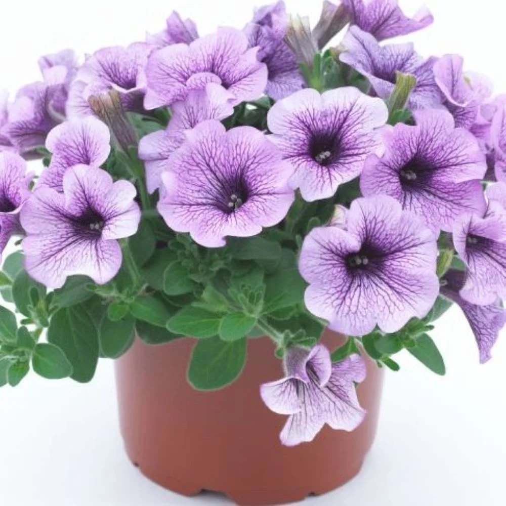 Петуния Сурфиния Компакт Парпл Вейн — ампельный сорт с уникальной окраской цветков. Насыщенный фиолетовый фон украшен контрастными прожилками, создающими изысканный мраморный узор. Предпочитает солнечные участки, переносит лёгкую полутень. Полив: регулярный, без переувлажнения. Цветение обильное и продолжительное. Цветы распускаются равномерно по всей поверхности растения, создавая эффект фонтана. подходит для создания подвесных композиций, оформления балконов и террас. Компактная форма позволяет использовать сорт в смешанных контейнерных посадках, где он прекрасно сочетается с другими летниками. Цветение начинается в мае и продолжается до первых заморозков. Высота 25-30 см.