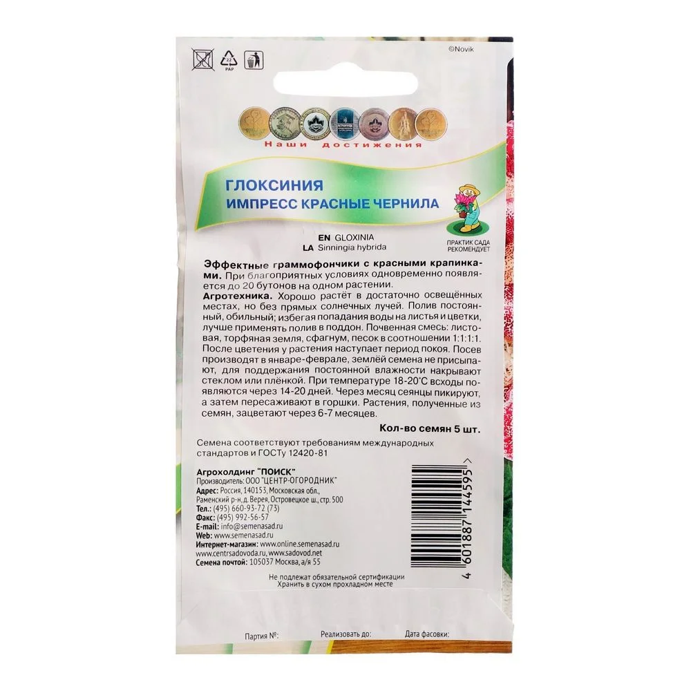 Эффектные граммофончики с красными крапинками. При благоприятных условиях одновременно появляются до 20 бутонов на одном растении. Хорошо растет в достаточно освещенных местах, но без прямых солнечных лучей. Полив постоянный, обильный; избегая попадания воды на листья и цветки, лучше применять полив в поддон. Почвенная смесь: листовая, торфяная земля, сфагнум, песок в отношении 1:1:1:1. После цветения у растения наступает период покоя.Посев производят в январе-феврале, землей семена не присыпают, для поддержания постоянной влажности накрывают стеклом или пленкой. При температуре 18-20°C всходы появляются через 14-20 дней. Через месяц сеянцы пикируют, а затем пересаживают в горшки. Растения, полученные из семян, зацветают через 6-7 месяцев.Семена соответствуют требованиям международных стандартов и ГОСТу РФ 12420-81