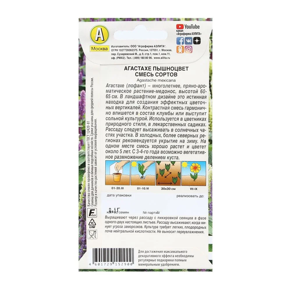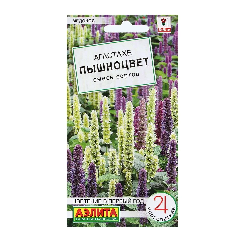 Агастахе (лофант) – многолетнее, пряно-ароматическое растение-медонос, высотой 60-65 см. В ландшафтном дизайне это истинная находка для создания эффектных цветочных вертикалей. Контрастная смесь гармонично впишется в состав клумбы или выступит сольной культурой. Используется в цветниках природного стиля, в лекарственных садиках. Рассаду следует высаживать в солнечных частях участка. В холодных, более северных регионах рекомендуется укрытие на зиму. На одном месте смесь хорошо растет и цветет около 5 лет. С 3-4-го года возможно вегетативное размножение делением куста.Выращивают через рассаду с пикировкой сеянцев в фазе одного-двух настоящих листьев. Рассаду высаживают, когда минует угроза заморозков. Культура требует легких, плодородных почв нейтральной кислотности. Не выносит переувлажнения.