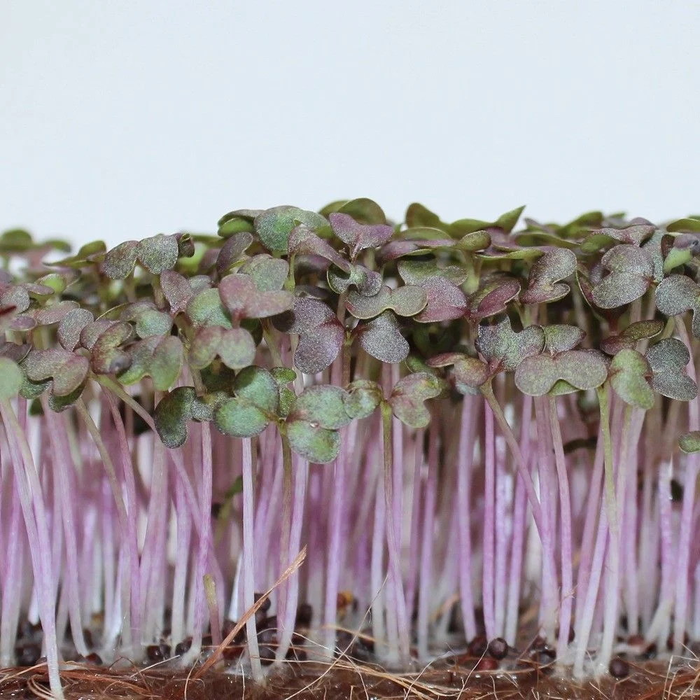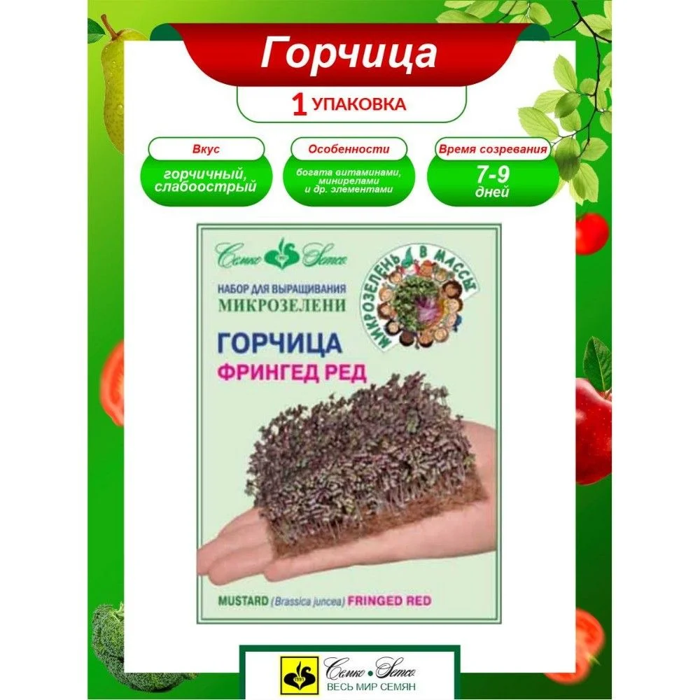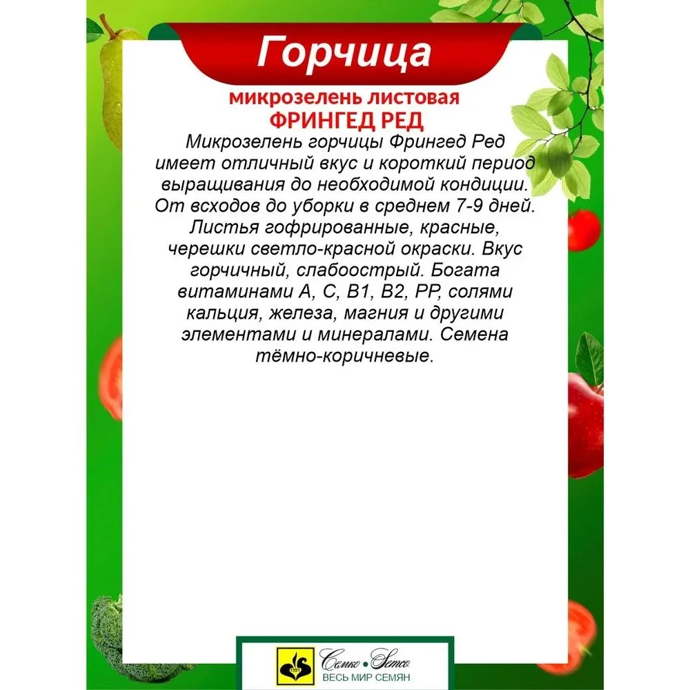 Микрозелень горчицы Фрингед Ред имеет отличный вкус и короткий период выращивания до необходимой кондиции. От всходов до уборки в среднем 7-9 дней. Листья гофрированные, красные, черешки светло-красной окраски. Вкус горчичный, слабоострый. Богата витаминами А, С, В1, В2, РР, солями кальция, железа, магния и другими элементами и минералами. Семена тёмно-коричневые. В 1 г до 625 семян.